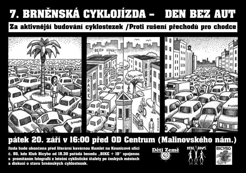 Pravidelná schůzka členů Klubu se koná od 17.00 hodin v předzahrádce pivnice Plzeňský dvůr (nebo uvnitř) na Šumavské ulici. Zveme všechny zájemce, kteří se chtějí zapojit do naší činnosti nebo se s námi prostě setkat. Budeme se domlouvat na zajištění cyklistické jízdy ke Dni bez aut. Pomozte nám, prosím s propagací této akce!20.9. (pá) Cyklojízda ke DNI BEZ AUT a beseda „BIKE + 10“ Podrobnosti naleznete v úvodu zpravodaje, pozvěte všechny známé a přátele.28.9. (so) Zavírání sezóny na cyklotrase Brno – Vídeň R Letošní společná podzimní jízda má cíl v blízkých Žabčicích v 11.30 hodin. U rybníčku za obcí se připravuje program ve velkém stanu Starobrna, táborák, rybí a zabíjačkové speciality a burčák. Sraz brněnských cyklistů je v 9 hodin u Zimního stadionu. Návrat individuální, možný i vlakem.2.10. (st) Schůzka Klubu Bicybo Další schůzka členů Klubu se koná od 17.00 hodin opět v předzahrádce pivnice Plzeňský dvůr (nebo asi uvnitř) na Šumavské ulici. |